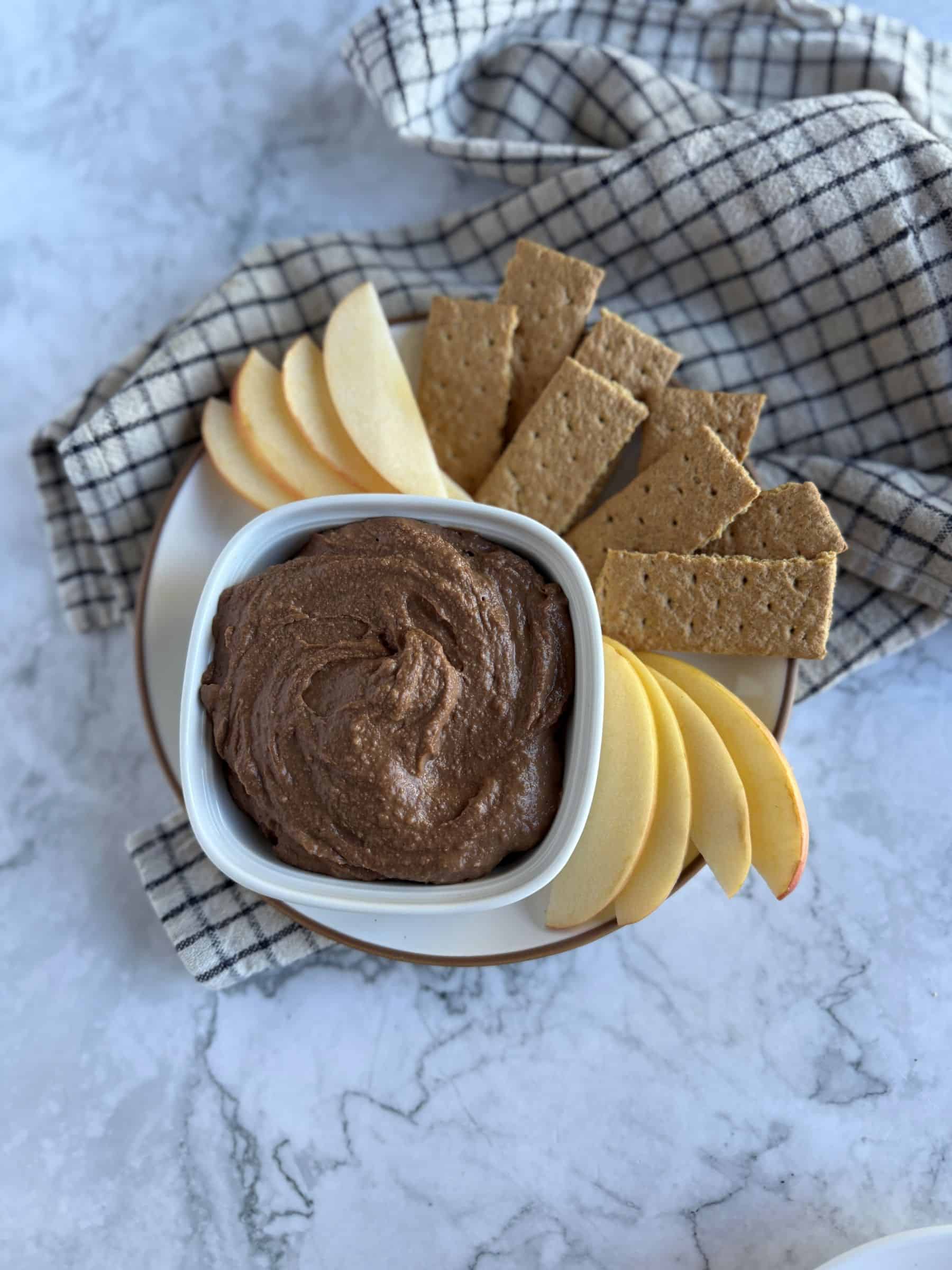 This chocolate protein hummus is creamy, chocolatey, and secretly packed with protein and fiber, the perfect snack the whole family will love!