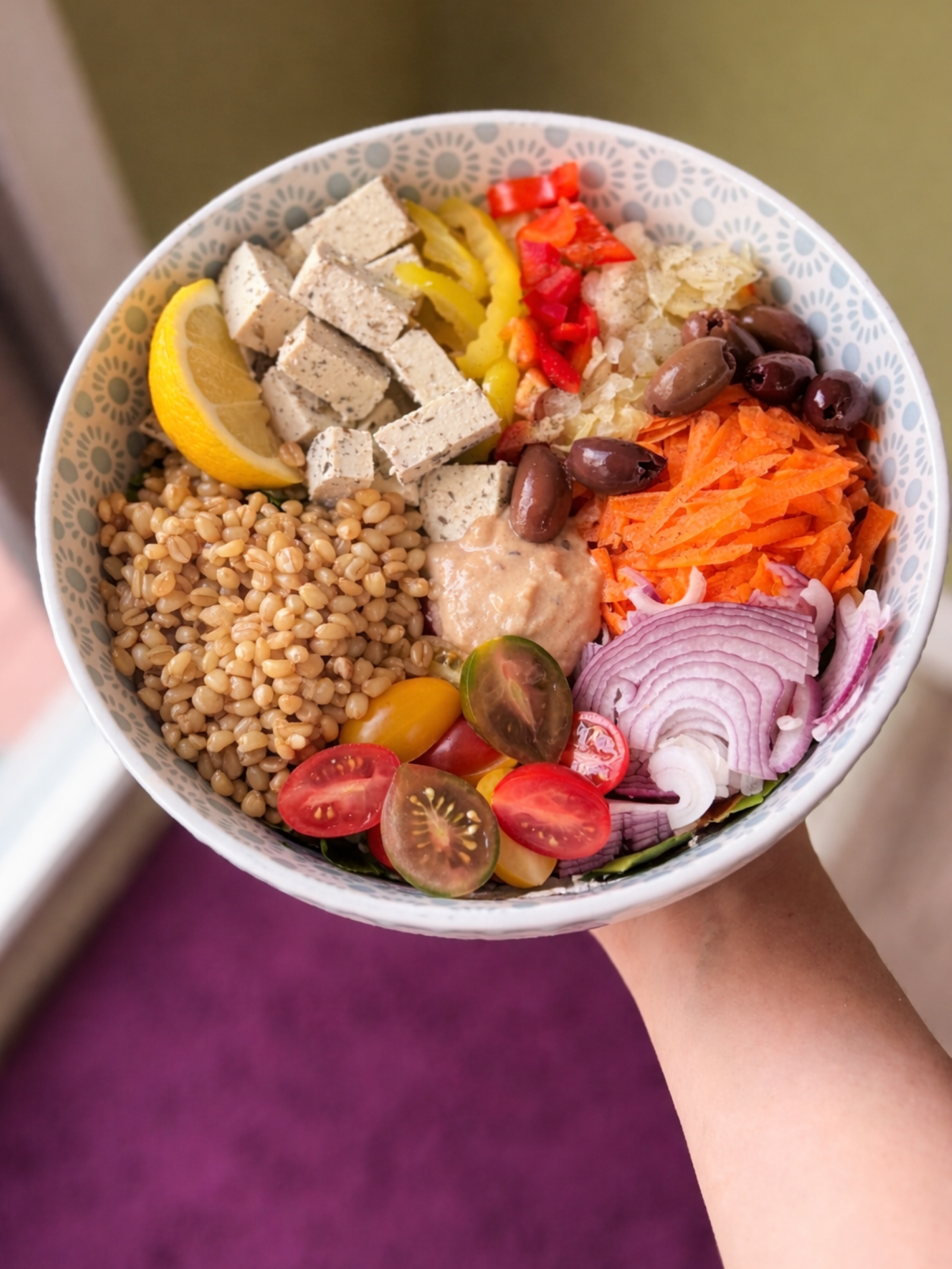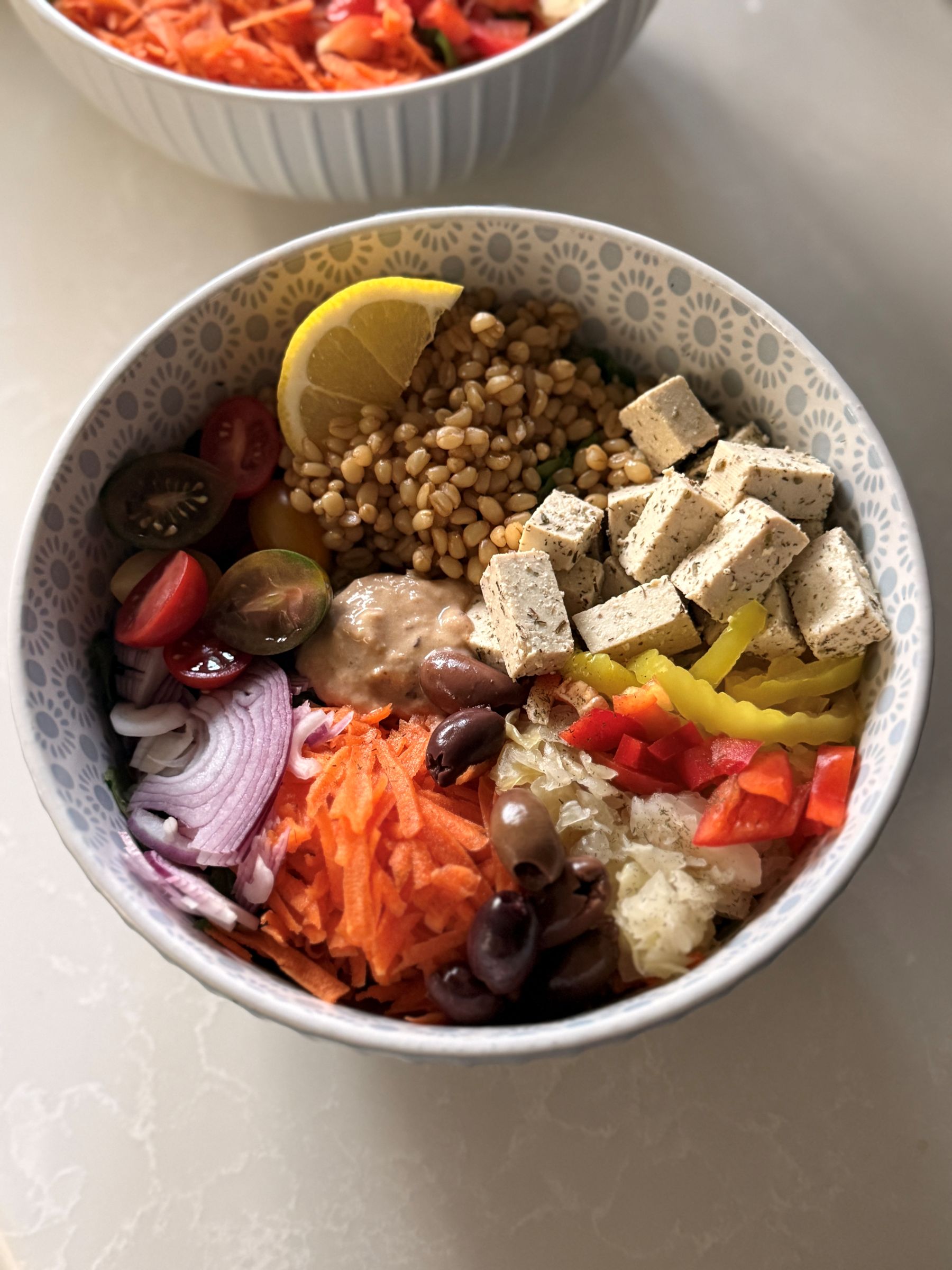 - In a large bowl, add the baby spinach, grated carrot, shredded cabbage (or sauerkraut), diced red pepper, thinly sliced red onion, cubed tofu, cooked grain, kalamata olives, and pickled banana peppers.