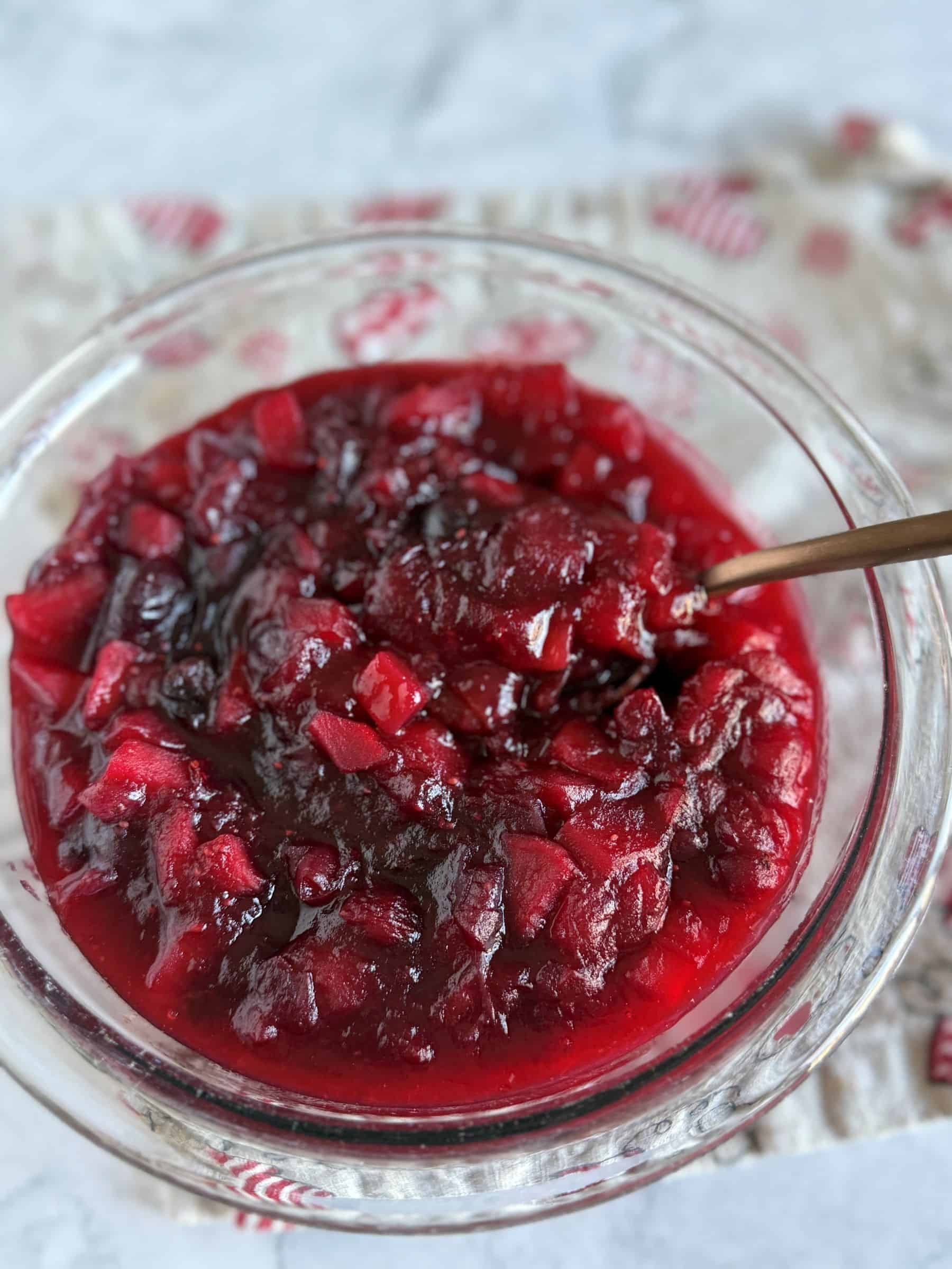 No holiday is complete without an amazing homemade cranberry sauce and this spiced version is the one you need to make this year! It's cozy and warm, featuring tender apples, bright orange and warm cinnamon. Easy, perfect to make in advance and delicious!